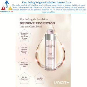 – Cái tên nói lên tất cả, Neigene Evolution Intense Care chính là Emulsion – chất nhũ tương chứa hỗn hợp ceramid độc đáo giúp củng cố hàng rào bảo vệ da, chứa 68% nước từ sinh vật phù du màu hồng giữ ẩm chuyên sâu, giảm mất nước cho da, tăng cường hàng rào bảo vệ cho da nhạy cảm, làm đều màu da, giúp da khỏe mạnh và mịn màng. Sản phẩm phù hợp với cả những người có làn da mỏng, người bị ngứa do da khô, và người muốn chống lão hóa da. Thử nghiệm lâm sàng cho thấy chỉ sau 5 ngày sử dụng Neigene Evolution Intense Care, da giảm mất nước đến 72.3%, cao hơn so với các vùng da không sử dụng sản phẩm.