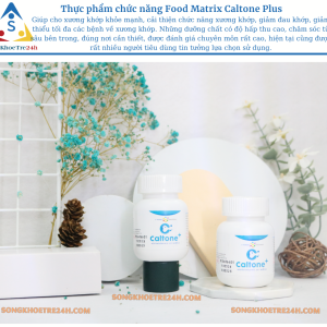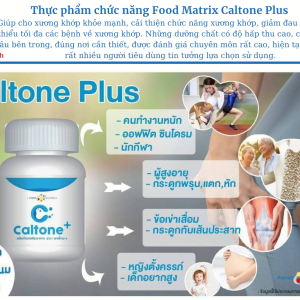 Sản phẩm Food Matrix Caltone+ Plus cho xương khớp khỏe mạnh, cải thiện chức năng xương khớp, giảm đau khớp, giảm thiểu tối đa các bệnh về xương khớp. Những dưỡng chất có độ hấp thu cao, chăm sóc từ sâu bên trong, đúng nơi cần thiết, được đánh giá chuyên môn rất cao, hiện tại cũng được rất nhiều người tiêu dùng tin tưởng lựa chọn sử dụng.