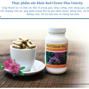 – Cỏ ba lá đỏ là loại thảo dược quý hiếm, mang nhiều lợi ích cho sức khỏe. Unicity Red Clover Plus là sản phẩm được tạo nên từ cỏ ba lá đỏ cùng nhiều loại thảo dược thiên nhiên khác như cây móng quỷ, cây me đất, cây cúc dại, rễ hoàng liên gai… giúp thanh lọc và thải các độc tố trong gan, tăng cường chức năng gan, phục hồi những tổn thương trên da, góp phần mang đến lá gan khỏe mạnh. Đồng thời, cải thiện chức năng đường ruột, hỗ trợ tiêu hóa và chống táo bón.